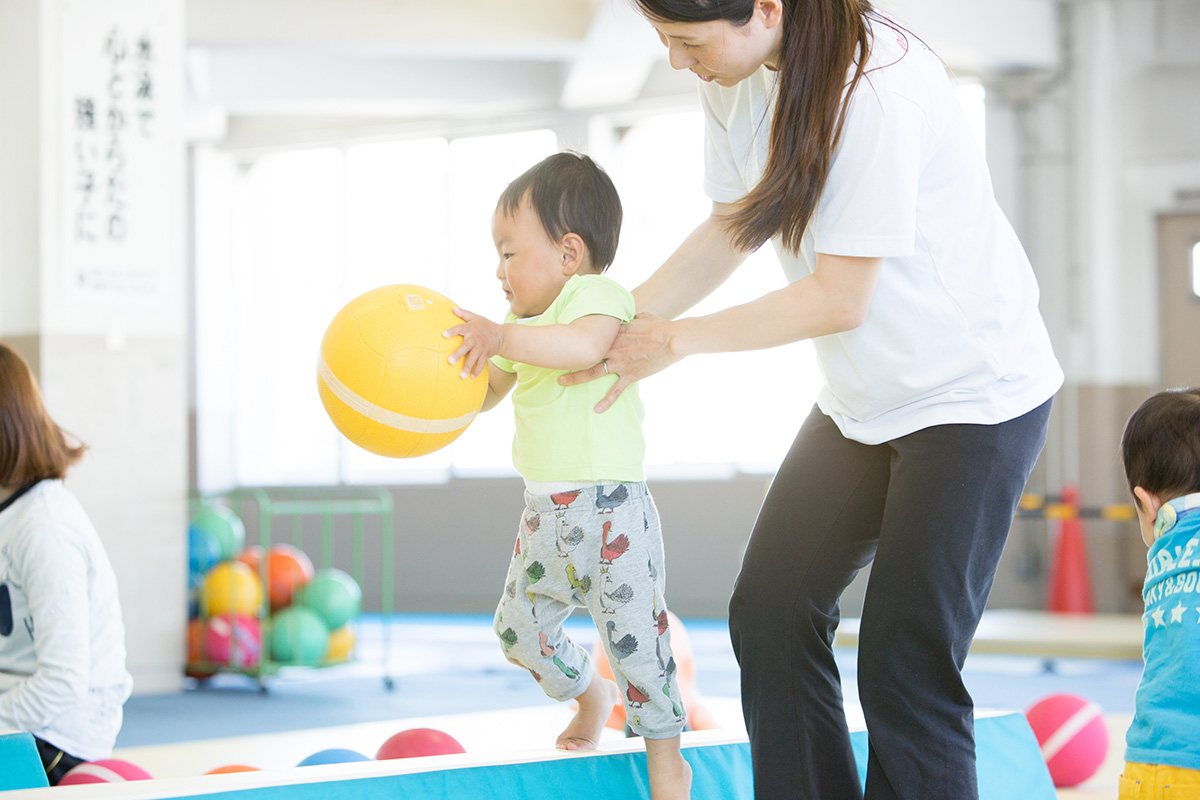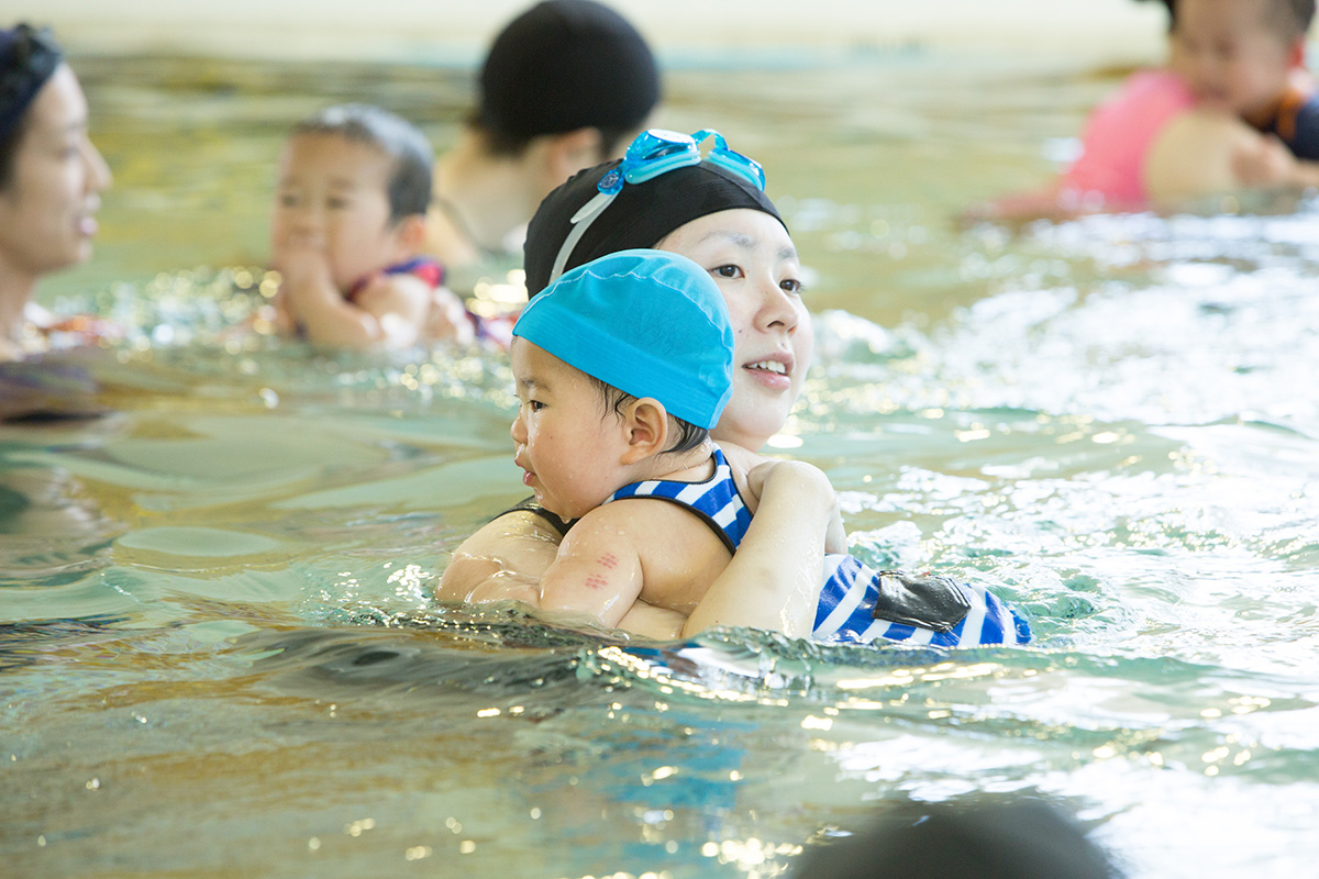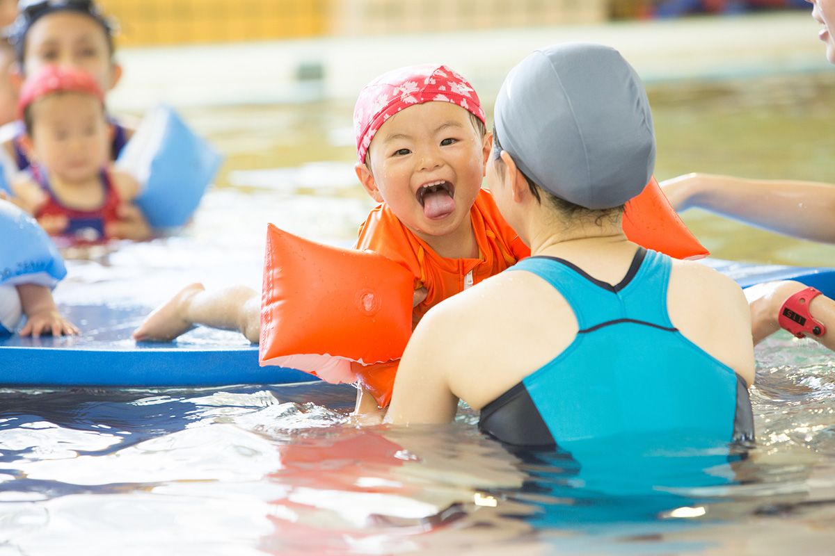 親御さんと赤ちゃんに一緒にプールに入って頂くことで、水を介して密接なふれあいが情緒面を豊にし、信頼関係を一層深めていきます。